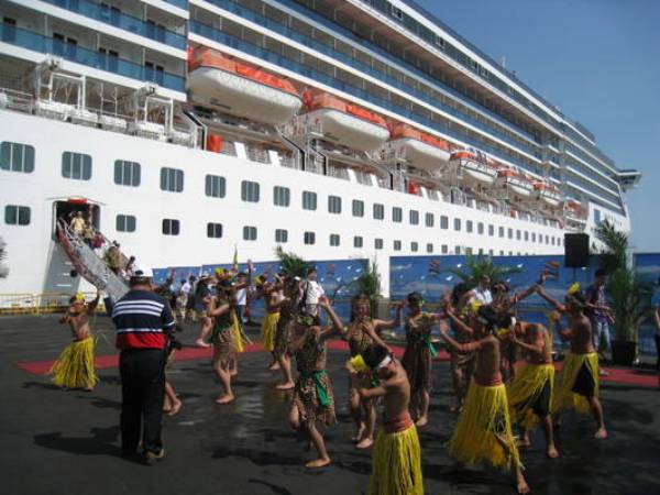 豪華國(guó)際郵輪“大西洋號(hào)”,今天帶來(lái)2600名游客抵達(dá)臺(tái)中港,臺(tái)中市政府觀光旅游局安排原住民歌舞迎賓。(圖片來(lái)自臺(tái)灣“中廣新聞網(wǎng)”)
