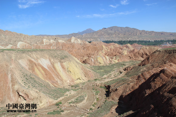 “海峽兩岸記者西北行”聯(lián)合采訪團參訪張掖丹霞國家地質(zhì)公園,感受中國第一七彩丘陵神奇景觀。(中國臺灣網(wǎng) 王文英 攝)
