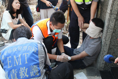 洪仲丘死后近1個月,門外男子自殘高喊“還我老婆”。(圖片取自臺灣“今日新聞網”)