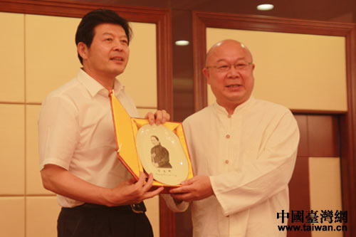 宋慶齡基金會(huì)常務(wù)副主席齊鳴秋向臺(tái)灣代表贈(zèng)送禮物。(中國(guó)臺(tái)灣網(wǎng) 雍紫薇 攝)