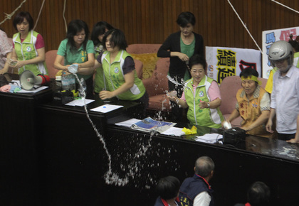 主席臺上的民進黨籍“立委”向臺下國民黨籍“立委”潑水,以防守住陣地。(圖片取自臺媒)