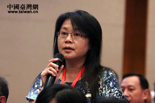 來自臺(tái)灣的一位客家女士向兩岸專家學(xué)者就“客家文化發(fā)展與客家語(yǔ)言保存”等相關(guān)方面進(jìn)行提問。(中國(guó)臺(tái)灣網(wǎng) 郜利敏 攝)