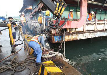 工作人員準(zhǔn)備切割纜繩。(圖片來自臺媒)