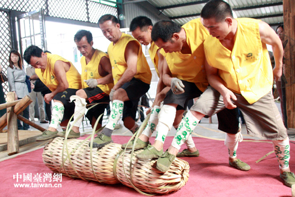 工人們向兩岸記者展示了制作千兩茶的獨特工序。(中國臺灣網(wǎng) 李徽 攝)