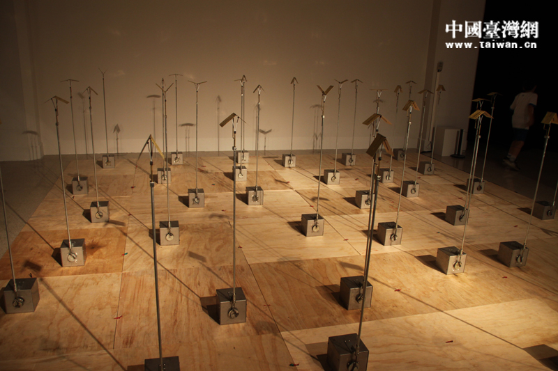 臺灣藝術(shù)家徐瑞憲的作品“旅行者之翼”用金屬、銅片、馬達(dá)、電線、變壓器、感應(yīng)器等制作,只要有人走近,金屬片就會煽動象征車票般的翅膀,從而實(shí)現(xiàn)與觀者的互動,堪稱神奇。(中國臺灣網(wǎng) 蕪?fù)?攝)