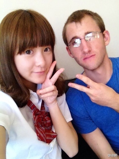 徐嬌(左)在微博貼上和寄宿家庭老外朋友的合照。(圖片來自臺媒)