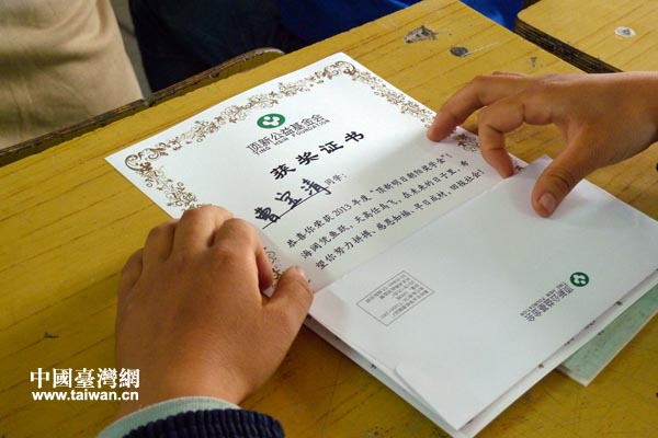 頂新明日朝陽獎學(xué)金獲獎證書上寫著勉勵學(xué)生的話語(中國臺灣網(wǎng) 李徽 攝)