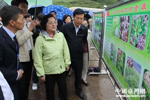 林文漪冒雨考察赫章平山鄉(xiāng)農(nóng)場(chǎng)壩GAP中藥材示范基地。右一為畢節(jié)市委書記張吉勇。(中國(guó)臺(tái)灣網(wǎng)發(fā) 畢磊 攝)
