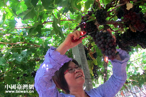 參訪團(tuán)成員在兵農(nóng)葡萄莊園體驗(yàn)采摘。(中國臺(tái)灣網(wǎng) 王偉 攝)