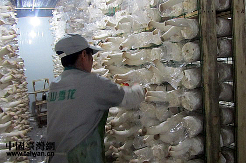 工人在采摘食用菌。(中國臺(tái)灣網(wǎng) 王偉 攝)