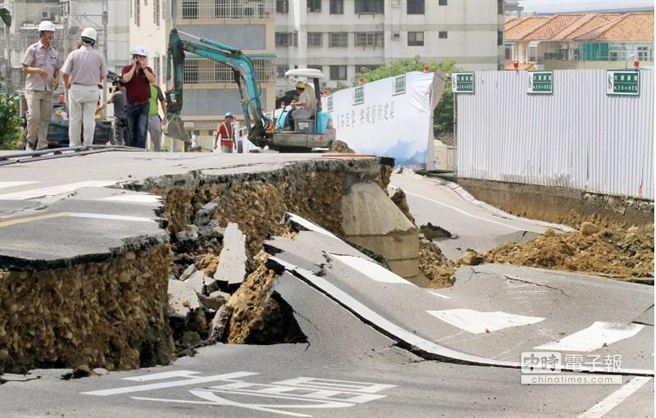馬路嚴(yán)重坍塌疑因鄰近工地施工防護(hù)不當(dāng)而造成,事發(fā)后工程人員趕緊前往現(xiàn)場(chǎng)勘查并設(shè)法善后。(圖片來(lái)自臺(tái)媒)
