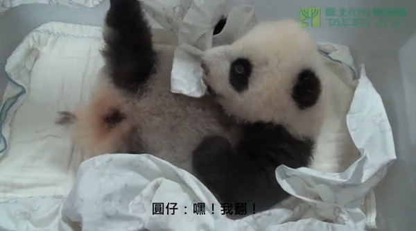 圓仔現(xiàn)在已經(jīng)自行成功翻身幾次,但成功率并不高。園方表示,大熊貓寶寶通常在3至4個月大的階段,活動都必須靠媽媽幫忙,約4個多月大時,就可以漸漸開始自行正;顒。有些大熊貓寶寶在1、2個月大時就會自行翻身,但也有比較慢一點的。