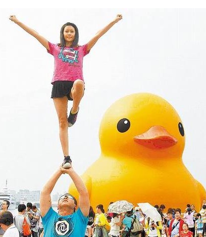 大四女學(xué)生戴麗絲以拉拉隊(duì)技法與小黃鴨合影,讓人嘆為觀止。(圖片來(lái)自臺(tái)媒)