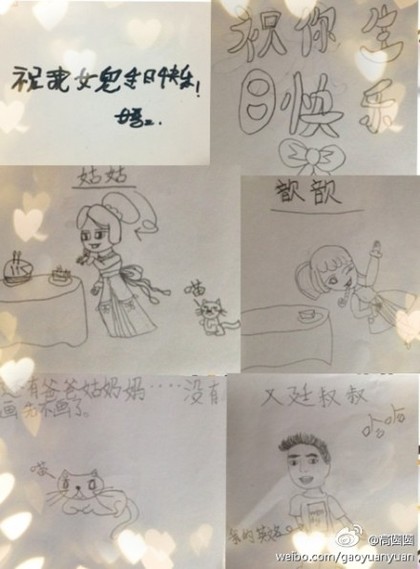 高圓圓5日夜po出小朋友送的生日畫作,右下角“又廷叔叔”成為焦點。(圖片取自高圓圓微博)