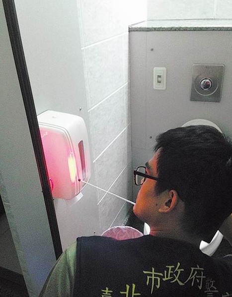 警方鑒識(shí)人員持儀器,在該大樓女廁察看有無(wú)遭裝偷拍器材。(圖片來(lái)自臺(tái)媒)