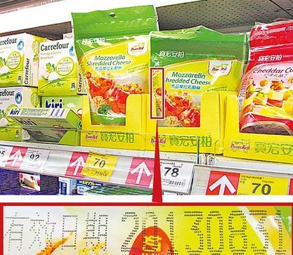標(biāo)示8月31日(紅框處)就過期的奶酪絲,9月17日仍在家樂福新店店架上販賣。(圖片來自臺媒)