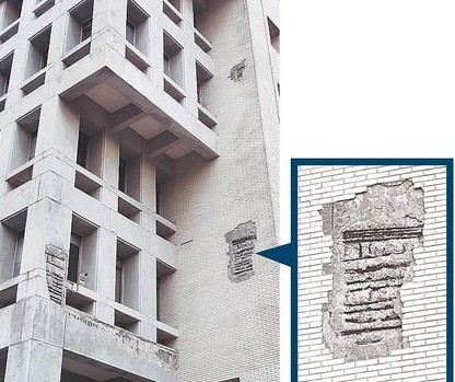 臺灣政大行政大樓是海砂屋,讓學(xué)生人人自危;圖為大樓外墻磁磚剝落露出鋼筋。(圖片來自臺媒)