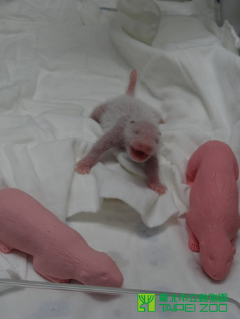 5天大的圓仔與橡膠大貓熊玩偶作對(duì)比(圖片取自臺(tái)媒)