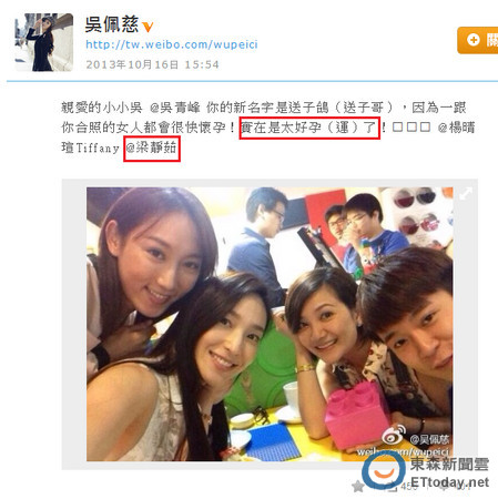 梁靜茹與美籍華裔商人趙元同結(jié)婚3年,兩人婚姻幸福美滿,但一直沒有傳出懷孕的消息。吳佩慈16日和一群好姐妹吃飯,在場還有蘇打綠主唱青峰,她在微博上直指他是“送子哥”,笑稱:“因?yàn)橐桓愫险盏呐硕紩?huì)很快懷孕!實(shí)在是太好孕(運(yùn))了!”并放上和梁靜茹與楊晴瑄的4人合照。