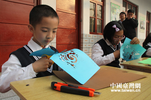 沁陽市實驗小學(xué)“魔幻小手”學(xué)生社團(tuán)成員為臺灣師生表演剪紙藝術(shù)。(中國臺灣網(wǎng) 扶海濤 攝)
