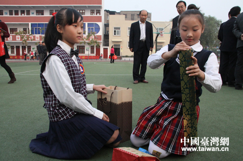 臺灣曹公小學(xué)學(xué)生代表與河南省沁陽市實驗小學(xué)學(xué)生互相交換禮品。(中國臺灣網(wǎng) 扶海濤 攝)