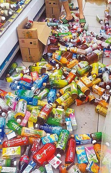 昨地震發(fā)生后,花蓮鳳林鎮(zhèn)超市內(nèi)的飲料掉滿地。(臺(tái)媒圖)