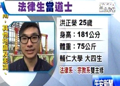 大四學(xué)生洪正榮因?yàn)闊釔?ài)宗教,回鄉(xiāng)參加成功登刀梯、下釘梯,晉升為正式道士。他年僅25歲,就讀輔仁大學(xué),由于興趣選讀法律系和宗教系雙主修,未來(lái)還想當(dāng)一名人權(quán)律師。洪正榮說(shuō):“希望藉由神的力量以及未來(lái)的法律專業(yè),希望帶給這個(gè)社會(huì)更大的幫助。”他說(shuō)鄰居伯公就是道士,從小到大耳濡目染,大三時(shí)就決定將對(duì)臺(tái)灣的宗教文化熱情化為行動(dòng),現(xiàn)在付諸實(shí)行夢(mèng)想成真。(中國(guó)臺(tái)灣網(wǎng) 高旭)