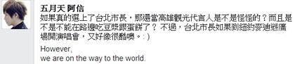 阿信在臉書回應(yīng)參選臺北市長一事。(圖片取自臺媒)