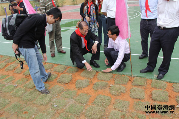 頂新公益基金會(huì)理事長(zhǎng)滕鴻年檢查捐建的梅林鎮(zhèn)中心小學(xué)運(yùn)動(dòng)場(chǎng)工程時(shí),仔細(xì)檢查工程質(zhì)量(中國(guó)臺(tái)灣網(wǎng) 蕪?fù)?攝)