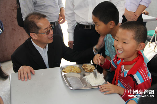 頂新公益基金會(huì)理事長(zhǎng)滕鴻年看望長(zhǎng)期支持的古竹中心小學(xué)時(shí),與正吃飯的小學(xué)生平等交談(中國(guó)臺(tái)灣網(wǎng) 蕪?fù)?攝)