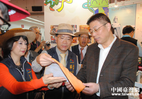 11月9日上午,北京市副市長戴均良(右)在臺中市副市長蔡炳坤(中)和臺中市文化局長葉樹姍(左)陪同下,參觀第八屆文博會臺灣文創(chuàng)精品館。(中國臺灣網(wǎng)北京通訊員 郭寧 攝)