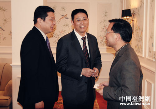 北京市副市長戴均良(中)11月8日下午會見由臺中市副市長蔡炳坤(右)任名譽(yù)團(tuán)長的臺灣文創(chuàng)參訪團(tuán)一行。北京市臺辦主任汪明浩陪同會見(左)。(中國臺灣網(wǎng)北京市通訊員 郭寧 攝)
