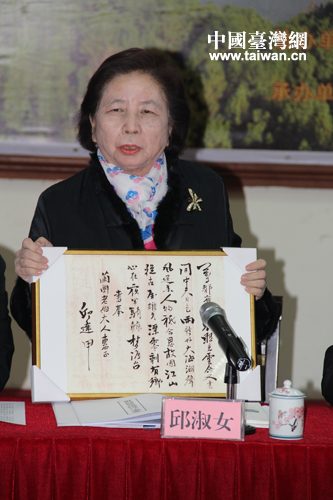 丘逢甲后人在座談會(huì)現(xiàn)場(chǎng)將新發(fā)現(xiàn)的丘逢甲佚詩(shī)贈(zèng)送給家鄉(xiāng)蕉嶺縣(中國(guó)臺(tái)灣網(wǎng) 蕪?fù)?攝)