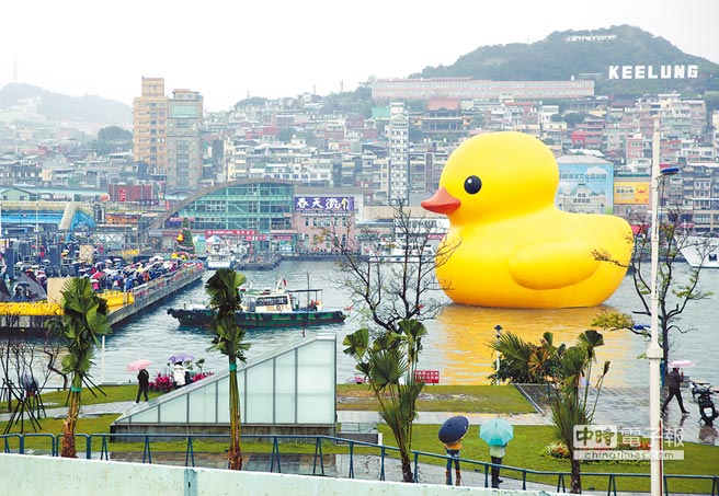 黃色小鴨20日在基隆港彩排,鴨迷冒雨前往觀賞,這次將在基隆待到明年2月8日農歷年過完。(圖片取自中時電子報)