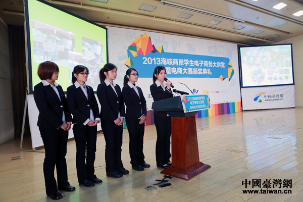 20日下午,由中國臺灣網(wǎng)(www.com3y.cn)、海峽兩岸互聯(lián)網(wǎng)交流委員會、中華臺灣MIT正品推廣協(xié)會主辦的“2013海峽兩岸學生電子商務大講堂暨電商大賽頒獎典禮”在京舉行。圖為臺灣區(qū)總決賽第一名獲獎團隊分享參賽心路歷程與收獲。(中國臺灣網(wǎng) 于斯文 攝)