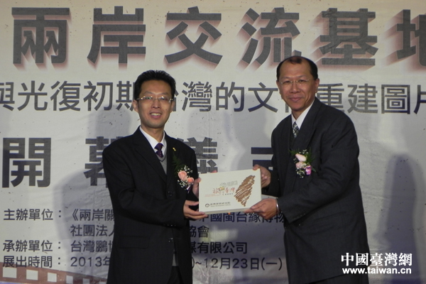 《兩岸關(guān)系》雜志社副社長(zhǎng)鐘河林與臺(tái)南市文化協(xié)會(huì)顧問(wèn)張先鵬互換禮品。(劉麗華攝)