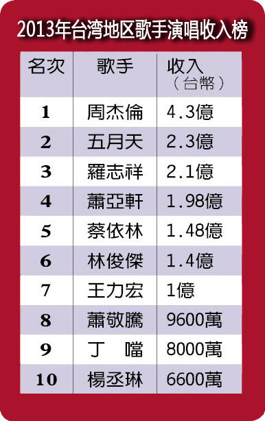 2013臺灣地區(qū)歌手演唱收入榜(圖片來自臺媒)