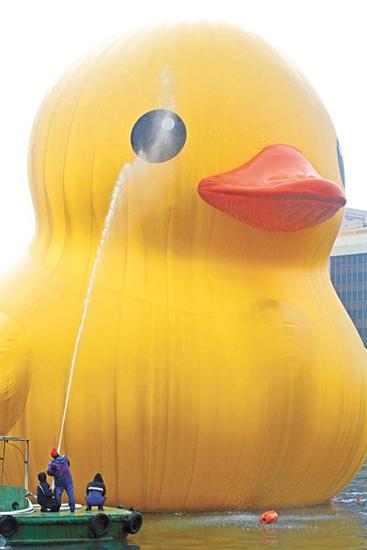 大黃鴨在基隆開展才2天身上沾滿灰塵污垢,主辦單位取得霍夫曼同意之后,昨日進(jìn)行清洗大黃鴨大作戰(zhàn)。這場大黃鴨洗澡濕背秀也吸引許多鴨迷圍觀。