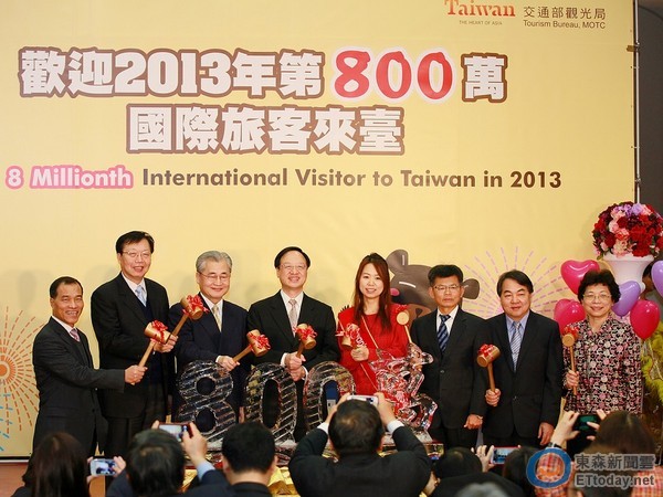 表彩(左5)成為2013年第800萬(wàn)名赴臺(tái)旅客,獲得各界滿滿的祝福。(臺(tái)媒圖)