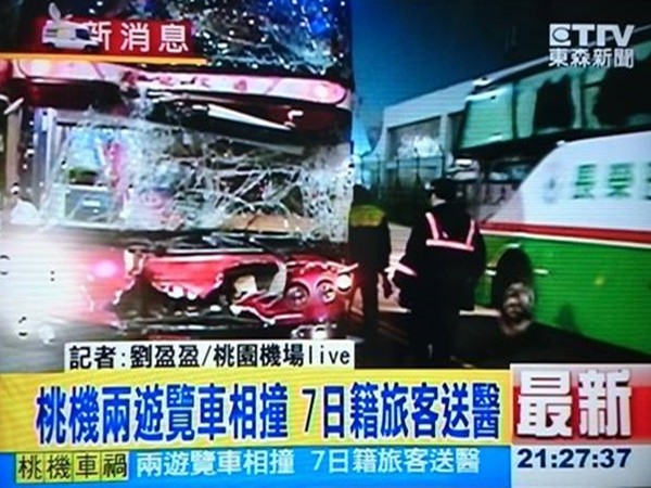 桃園機(jī)場(chǎng)晚間8時(shí)傳出游覽車相撞意外。(圖片來(lái)源:臺(tái)灣東森新聞)