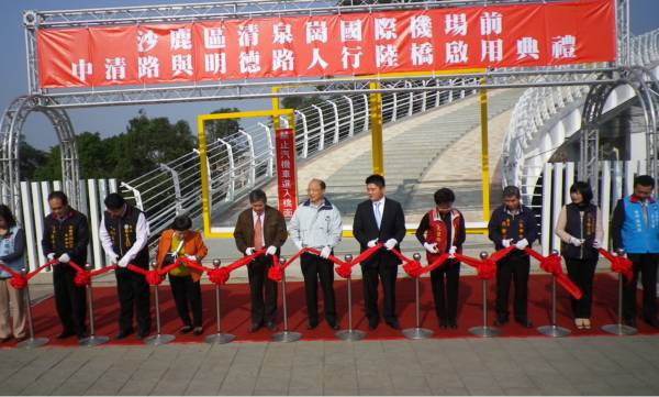 臺中國際機場前人行陸橋,經(jīng)費1.2億(新臺幣,下同),最后以8000多萬完成。其中,中央塔高31米,橋?qū)?米,全長163米。因為夠?qū),可以牽著自行車過橋。胡志強說,當初顏清標“立委”爭取1.2億興建人行陸橋,如果是市政府,就不可能。完成后,不僅方便公明初中學(xué)生穿越車多的中清路,也要讓臺中航空城的發(fā)展越來越快。
