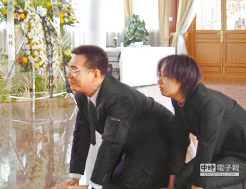 圖為林毅夫2002年在北京大學中國經(jīng)濟研究中心設置靈堂,通過網(wǎng)絡直播與宜蘭老家同步參加父親的告別式。告別式開始,林毅夫與女兒跪地哀傷地看著屏幕。(圖片來源:中時電子報)