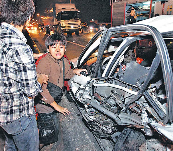 屏東駛往高雄的88快速道路昨日凌晨發(fā)生車禍,一名年長婦女被拋摔在大橋上,她的外孫(箭頭處)不知所措,路人見狀上前幫忙。來自臺(tái)媒