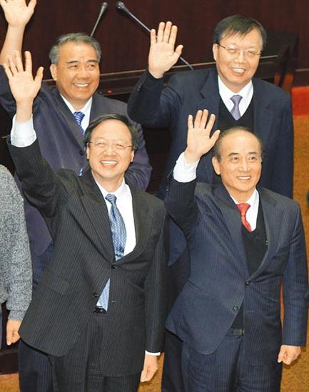 江宜樺依慣例,走向主席臺(tái)與王金平握手表示感謝。(圖片來(lái)自臺(tái)媒)