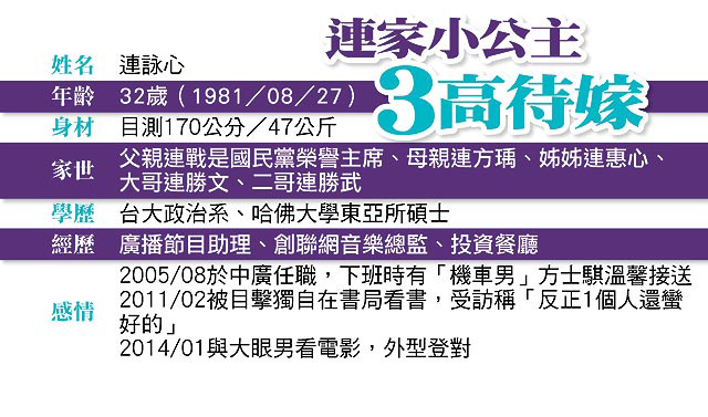 中國臺灣網(wǎng)1月19日消息 據(jù)臺灣媒體報道,國民黨榮譽主席連戰(zhàn)育有2子2女,至今只剩32歲的小女兒連詠心還未結(jié)婚。前晚,有記者目擊她和1名高大男子在影城買快餐、喝飲料,身旁的“他”是不是男友?連詠心否認(rèn),表示2人是“大學(xué)同學(xué)”。