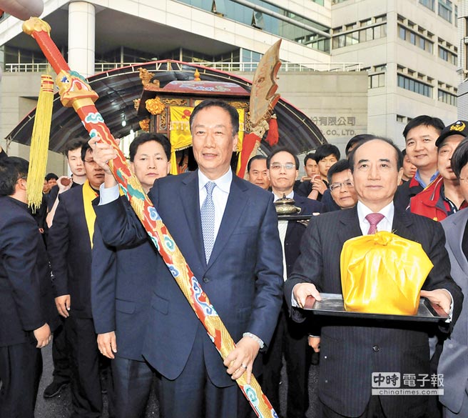 舉劍鍘內(nèi)鬼,篤信關(guān)公的鴻海集團(tuán)董事長郭臺銘,對收回扣弊案十分痛心,希望正義能伸張。圖為2013年郭臺銘(左)與臺“立法院長”王金平出席山西關(guān)公在臺繞境活動。(圖片來源:臺灣中時電子報)
