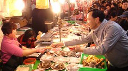 新北市長朱立倫(右)今天上午到汐止區(qū)市場訪視,邊拜年邊發(fā)紅包,民眾紛紛歡迎,引起不小騷動。(圖片來源:臺灣聯(lián)合新聞網(wǎng))