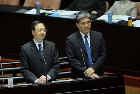 臺當局“行政院長”江宜樺(左)與“內(nèi)政部長”李鴻源(右)今日共赴“立法院”接受質(zhì)詢。(圖片來源:臺灣“中央社”)