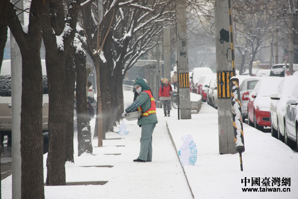 環(huán)衛(wèi)工人在拋灑融雪劑。(中國臺灣網(wǎng) 王文英攝)