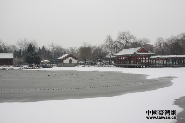 遠(yuǎn)攝雪中的北京大觀園湖泊。(中國(guó)臺(tái)灣網(wǎng) 王文英攝)